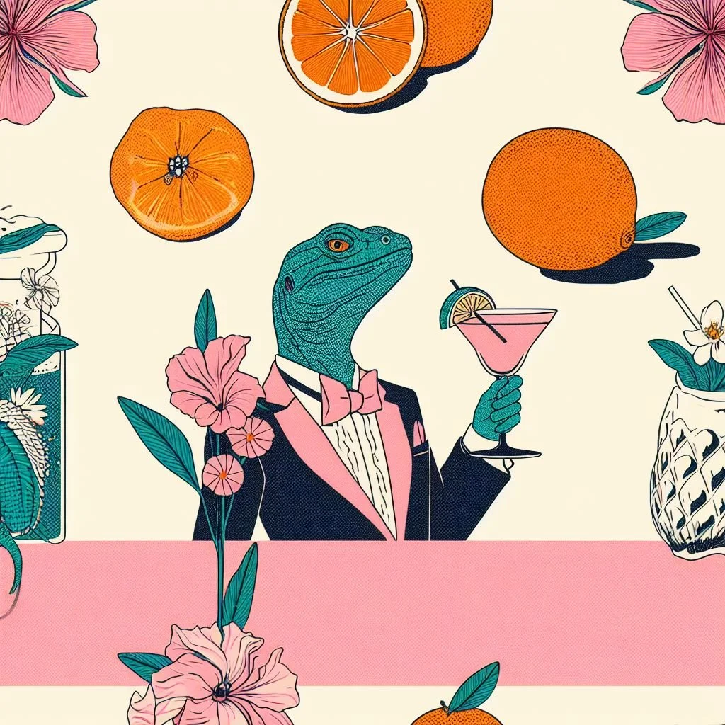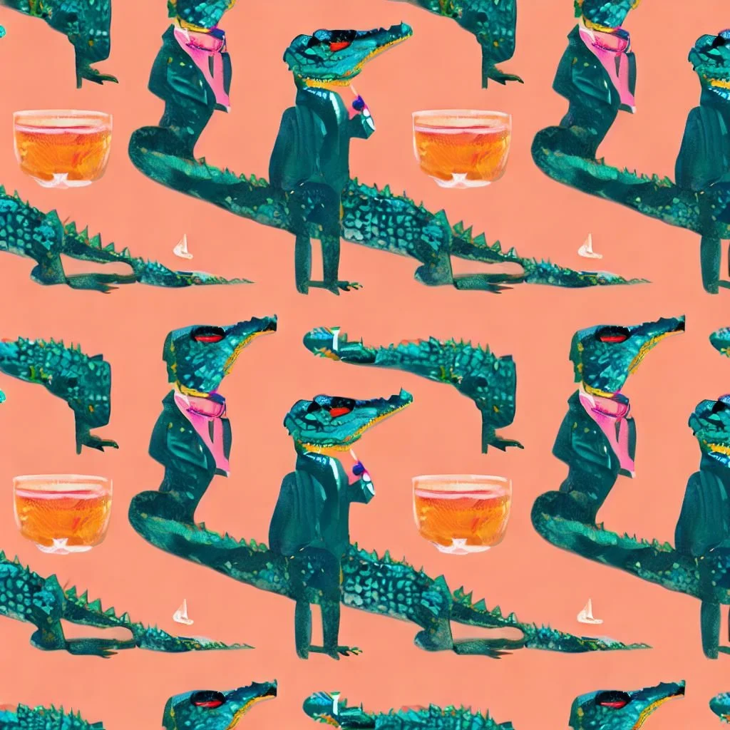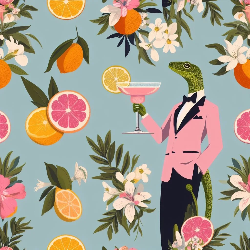 I began my ideations with the local food, drinks, and color of the Italian coast. That morphed into fauna. That morphed into whimsical ideas of make-believe cocktail lounges and the characters that frequent them. After AI prompt generation led me down a path of dapper lizards (head here to learn more about those gentlemen), I used those assets in Adobe Photoshop to design my final pattern: playing with position, size, and color correction.