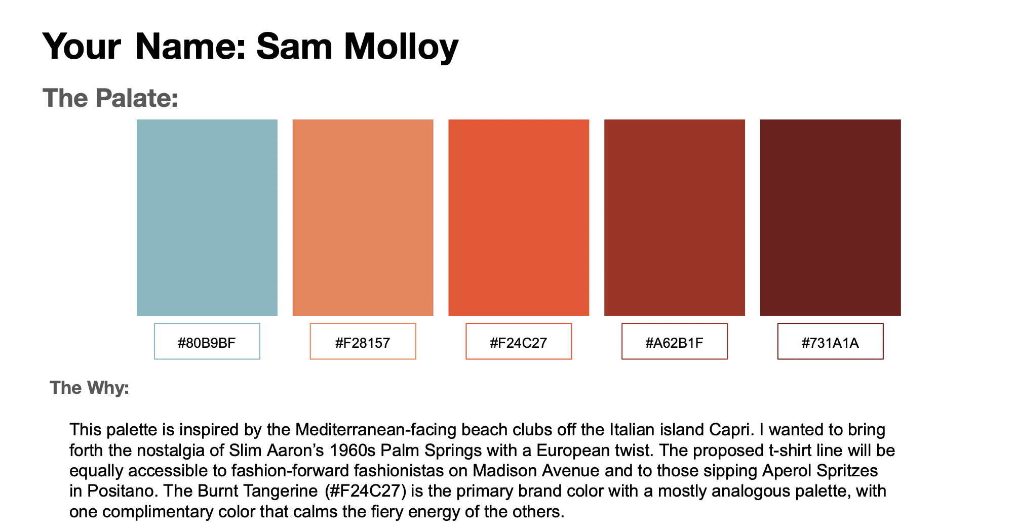 Who doesn’t wish they were on the coast of the Positano or floating around the Isle of Capri? This brand came to life based upon a color palette and a photo of the Italian coast. Using Adobe Color to create the palette, our class was individually tasked with creating a repeating pattern to participate in the 2024 Spring FashionMash Fashion Show.